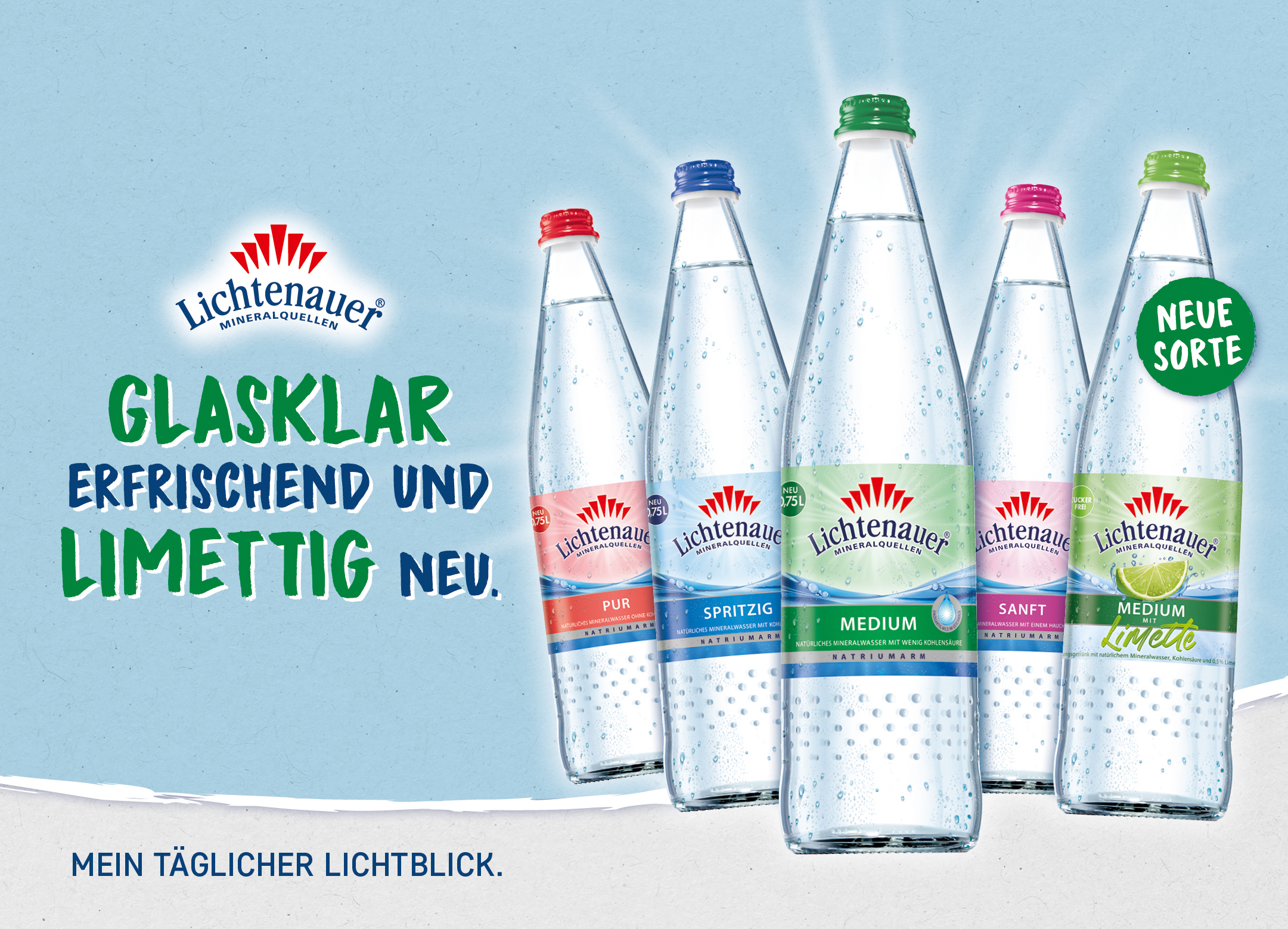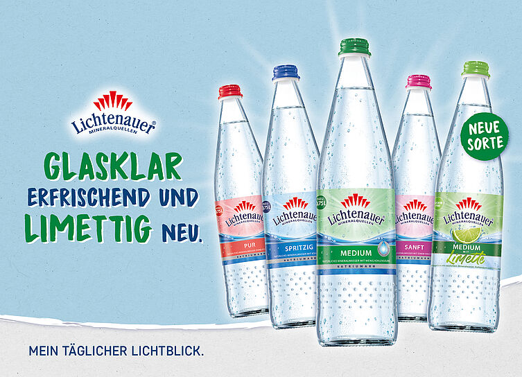 Lichtenauer Mineralwasser gibt es auch ab sofort in dem attraktiven 12 x 0,75 Liter Glas-Mehrweggebinde (N2) der Genossenschaft Deutscher Brunnen (GDB). Das umweltfreundliche Glasgebinde im Mehrwegkasten mit handlichem Mitteltragegriff gibt es für alle vier Lichtenauer Mineralwässer in den Kohlensäurevarianten Spritzig, Medium, Sanft und Pur sowie für die ganz neue Sorte Lichtenauer „Medium mit Limette“.